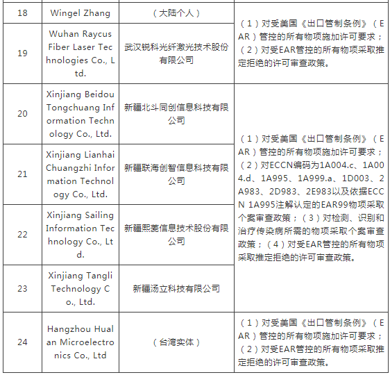 就在這個(gè)月的7月12日,美國(guó)商務(wù)部產(chǎn)業(yè)與安全局(BIS)通過(guò)《聯(lián)邦政府公報(bào)》(Federal Register)發(fā)布了一項(xiàng)最終規(guī)則(final rule),來(lái)自中國(guó)的24個(gè)實(shí)體/個(gè)人從事或促成了有違美國(guó)國(guó)家安全或外交政策利益的活動(dòng),因而將其列入“實(shí)體清單”。被列入清單的理由、列入后的許可要求和許可審查政策如下。